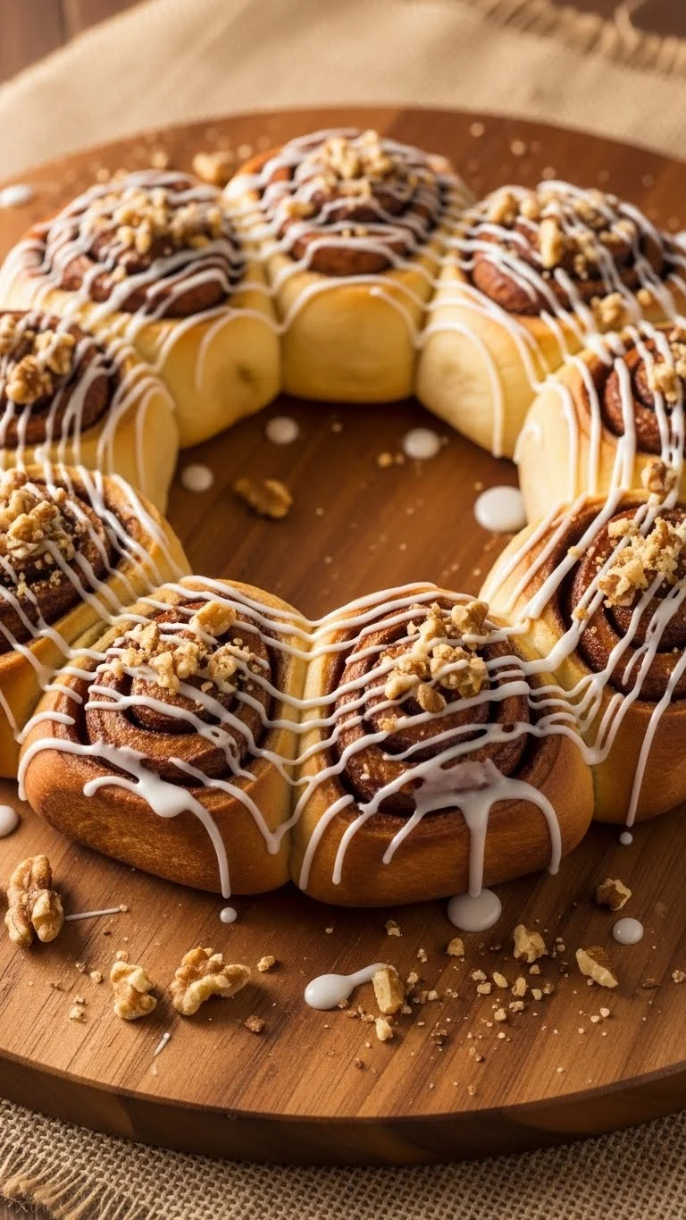 Place the wreath on a festive platter. Serve warm. Pair with coffee, hot chocolate, or holiday tea. Allow guests to pull pieces from the center. Add extra nuts or a dusting of powdered sugar for presentation.
