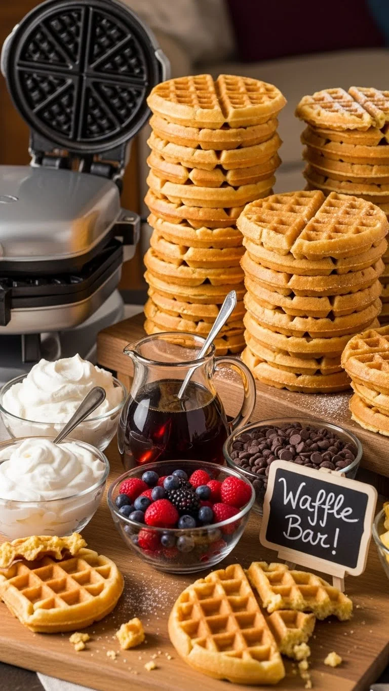 Set up a festive waffle station. Provide plates and utensils. Encourage guests to build their own waffles. Offer hot coffee or cocoa on the side. Refill toppings as needed.