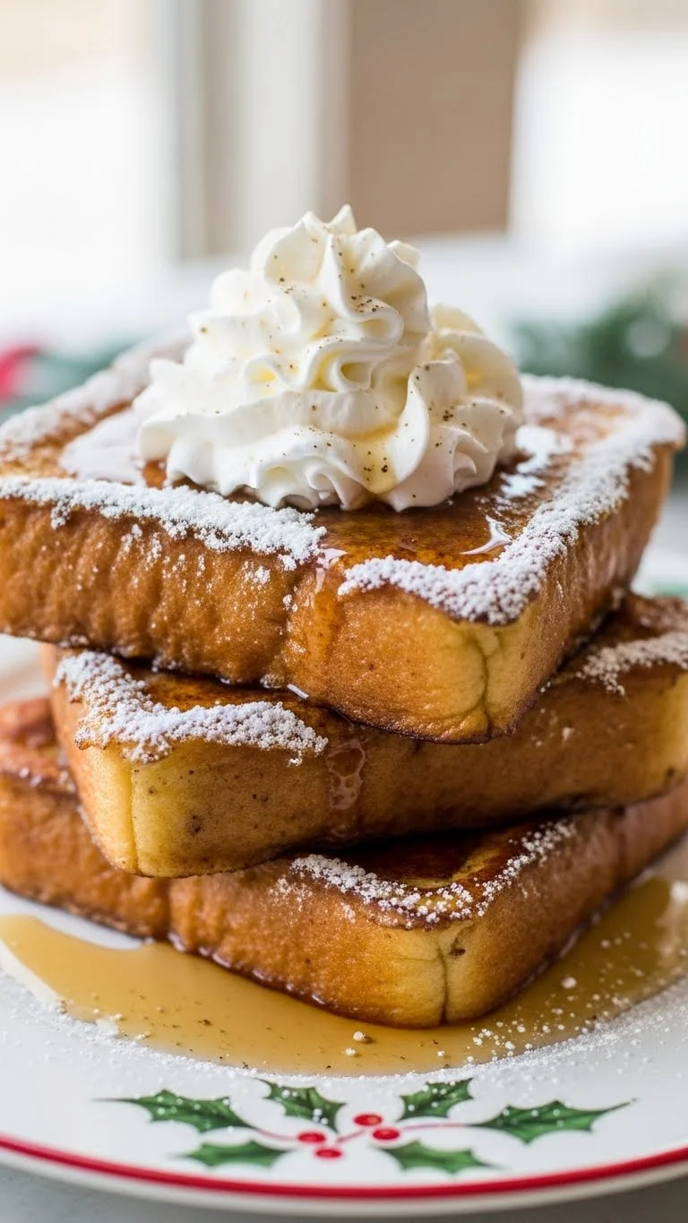 Eggnog French toast is a festive twist on a classic breakfast dish. The custard-soaked bread is rich and creamy, with seasonal nutmeg and vanilla flavors. Topped with whipped cream, it makes a decadent yet approachable brunch item for Christmas morning.