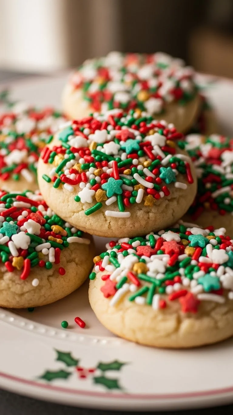 These sprinkle cookies are cheerful, buttery, and soft, with bright festive sprinkles on top. Their colorful appearance makes them irresistible for children and a visually appealing addition to cookie platters.