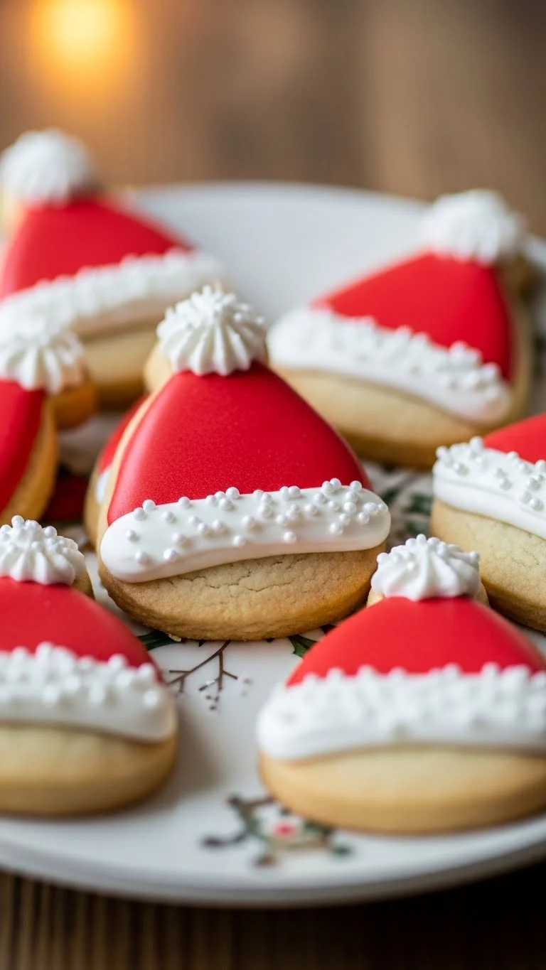 These Santa hat cookies are playful, colorful, and instantly recognizable. Red icing and white accents make them festive, perfect for holiday decorating activities or gift boxes.