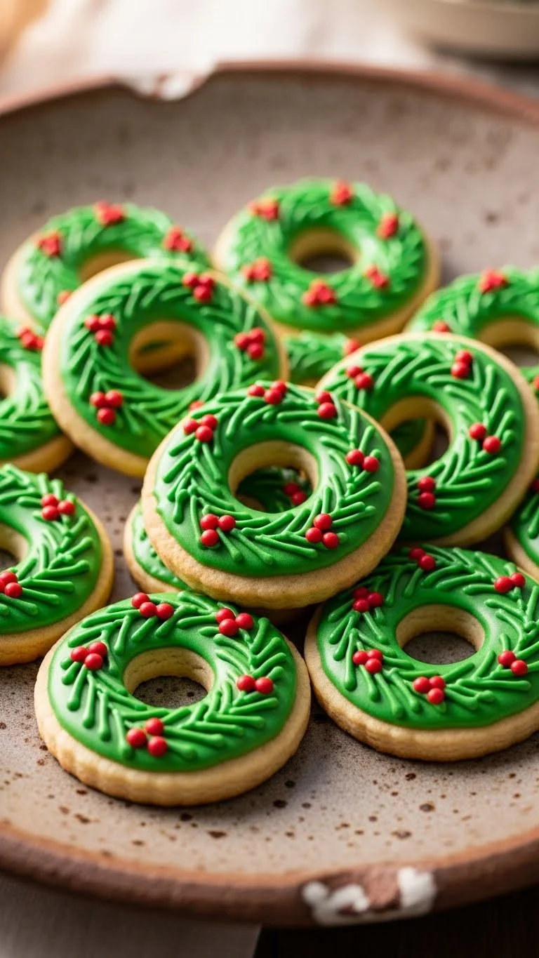 These wreath cookies are festive, circular cookies decorated with green icing and red candy accents to mimic holly berries. They bring charm and creativity to your holiday table.