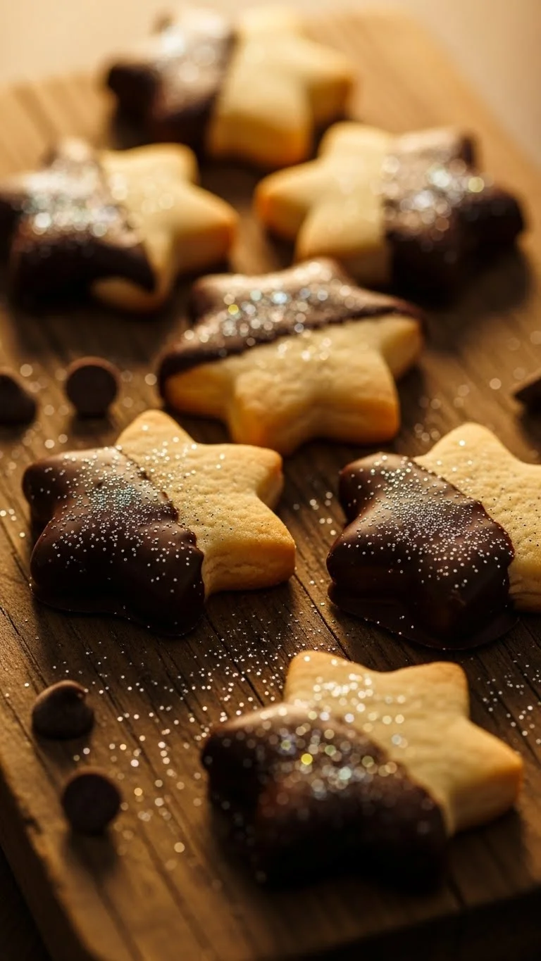 These star-shaped cookies are buttery and crisp with a rich chocolate coating on one edge, creating a simple yet elegant holiday treat. Sprinkling edible glitter adds sparkle, making them perfect for festive tables or gifting.