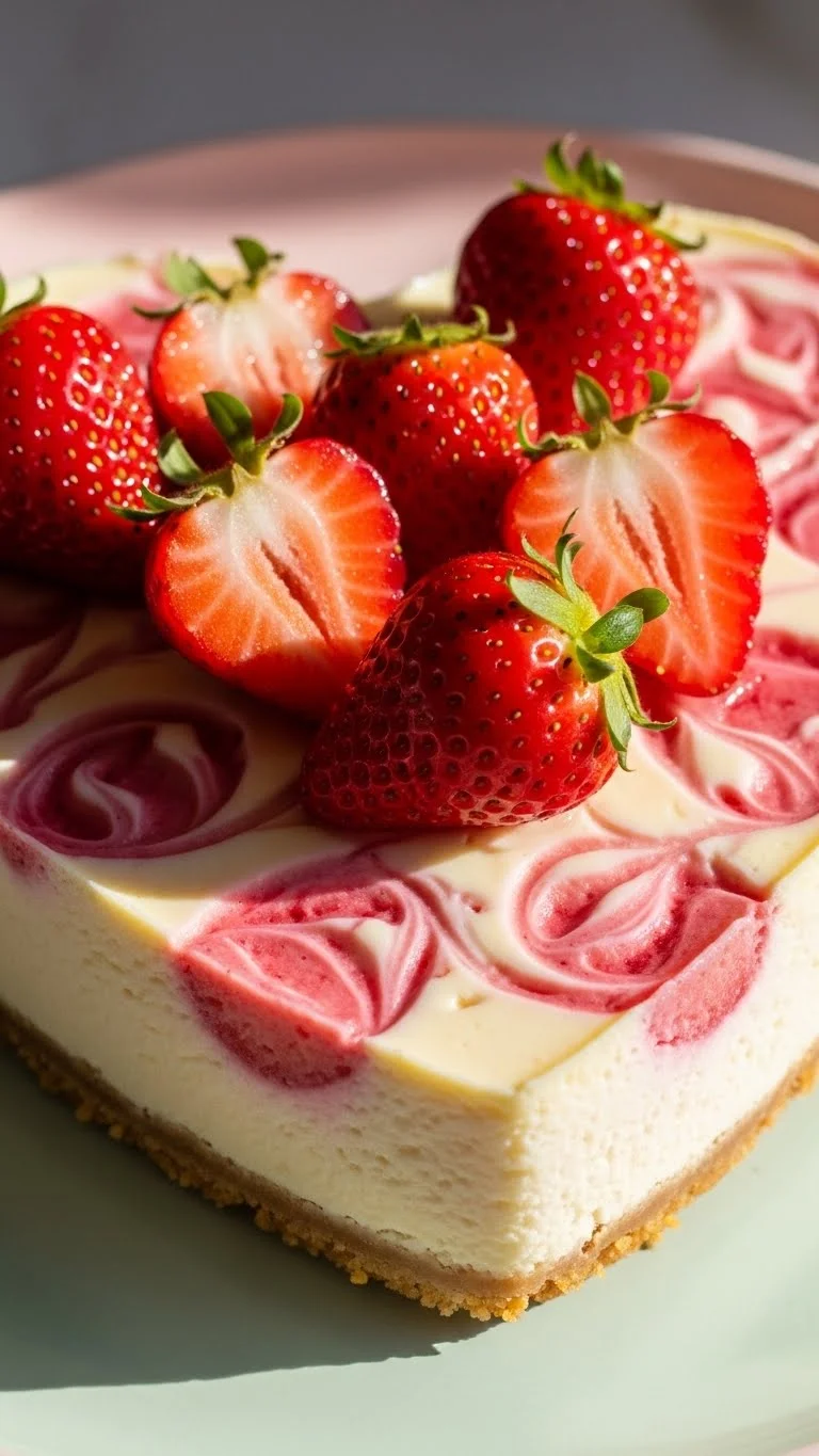 This cheesecake combines creamy, velvety filling with vibrant strawberry swirls, giving each slice a gorgeous pink pattern and a fresh, fruity flavor that feels festive and indulgent.