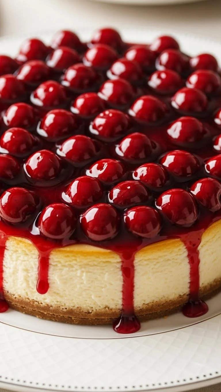 Sweet-tart cherry topping on a smooth cheesecake filling adds festive color and flavor for Valentine’s Day.
