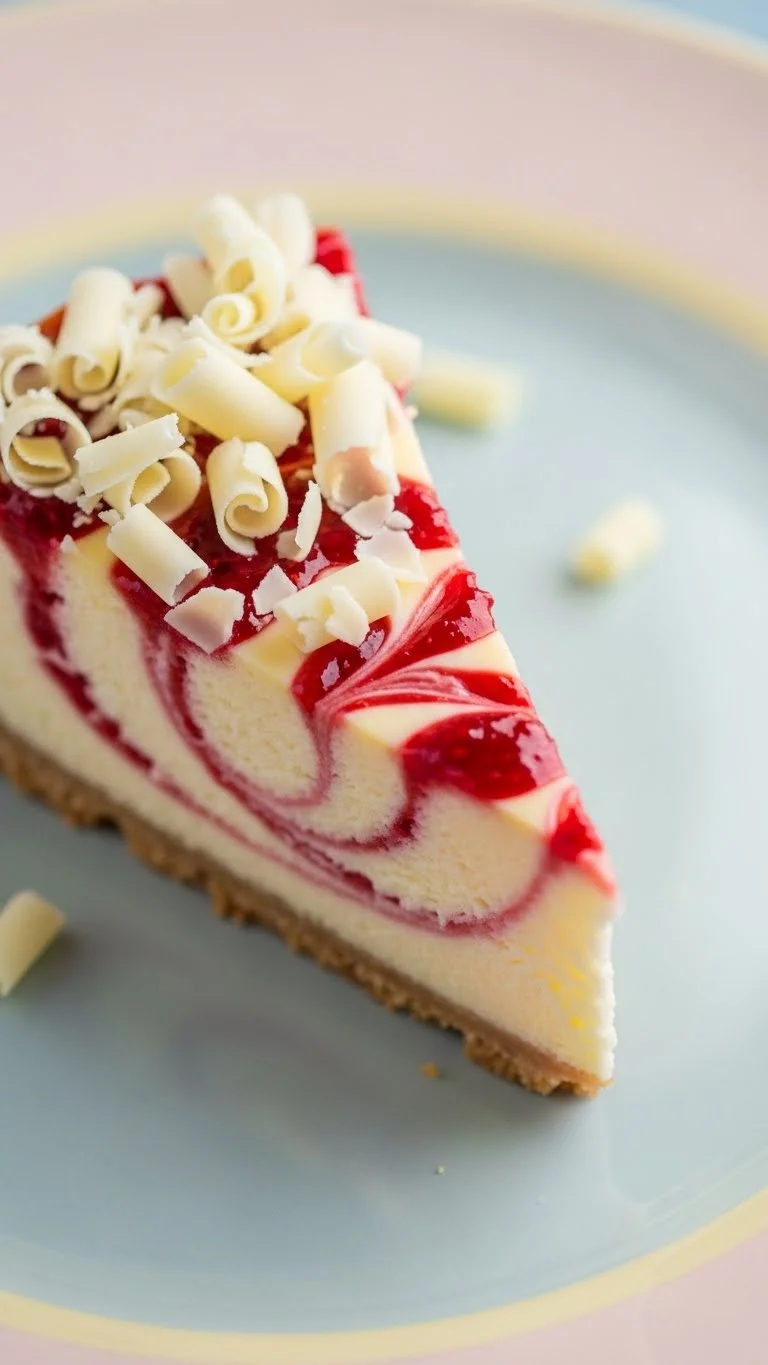 Top with fresh raspberries, white chocolate shavings, and a light dusting of powdered sugar. Serve on a decorative plate.
