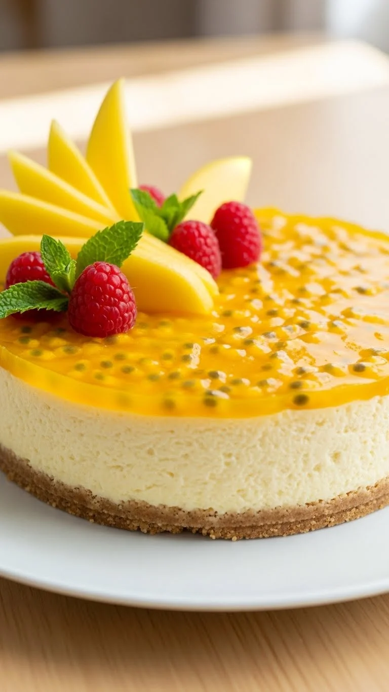 Tangy passionfruit topping adds an exotic and refreshing twist to a classic creamy cheesecake, perfect for a bright Valentine’s dessert.