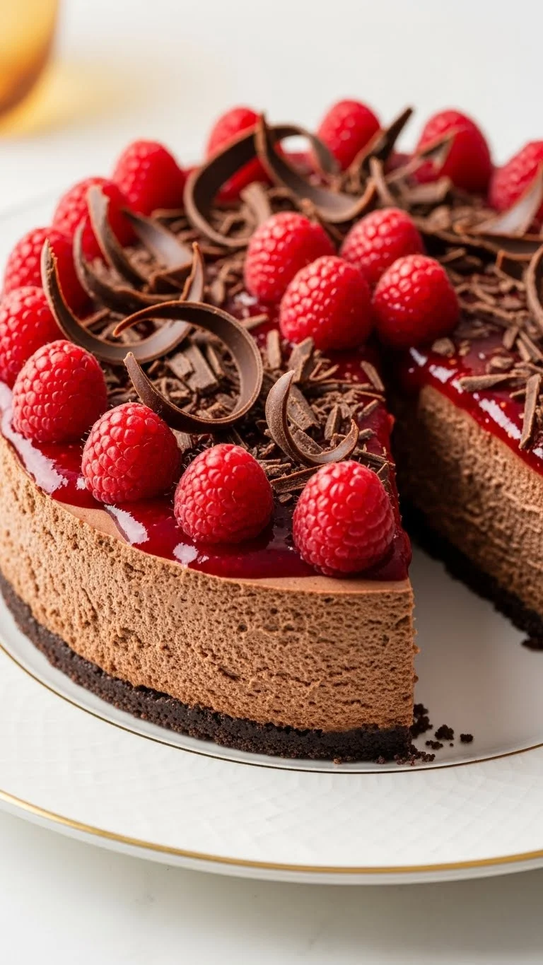 Decorate with fresh raspberries and chocolate curls. Serve chilled for a rich, romantic dessert.