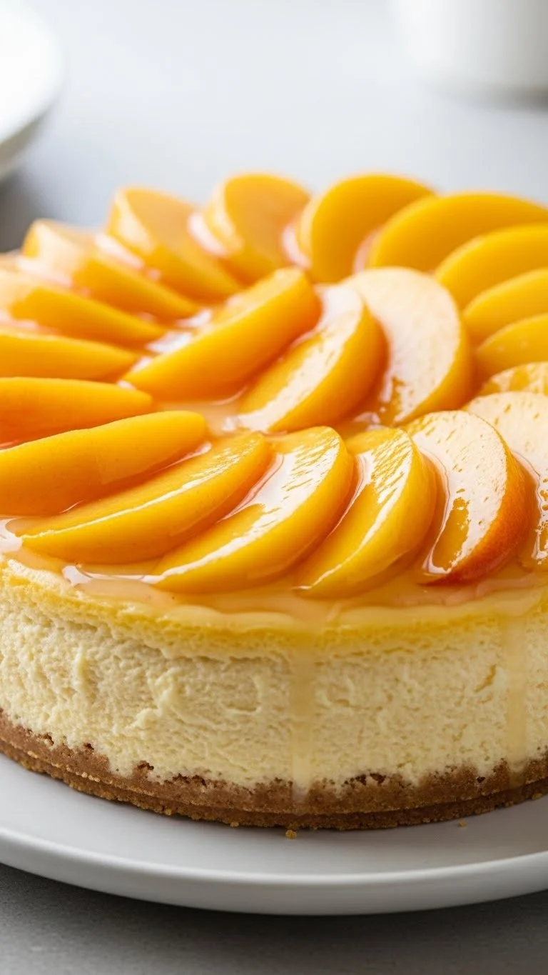 Sweet peaches on creamy cheesecake create a bright, fruity dessert that’s perfect for Valentine’s Day or spring celebrations.