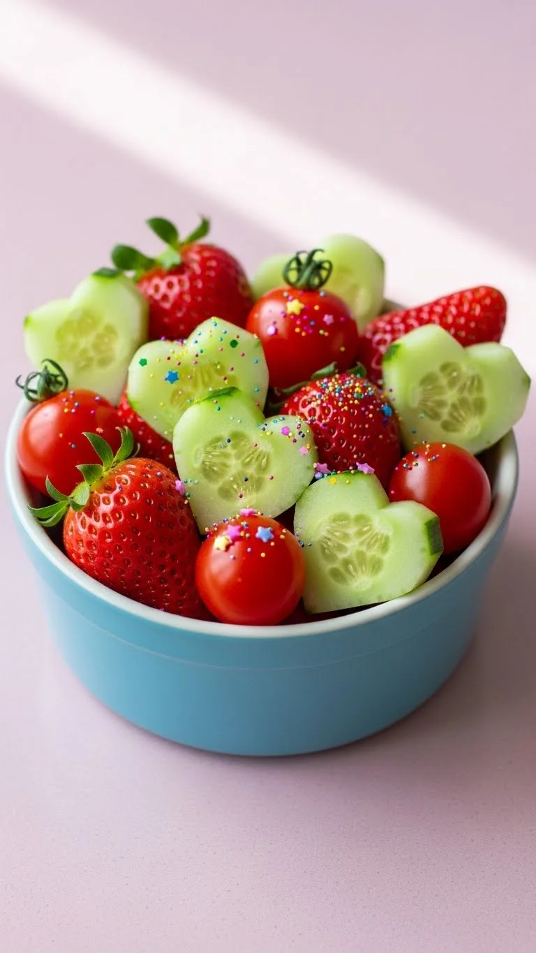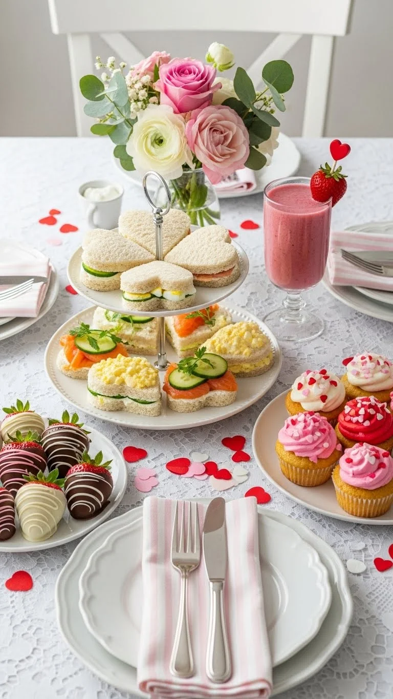 - Savory bites: Heart-shaped sandwiches, cheese and veggie skewers, mini quiches