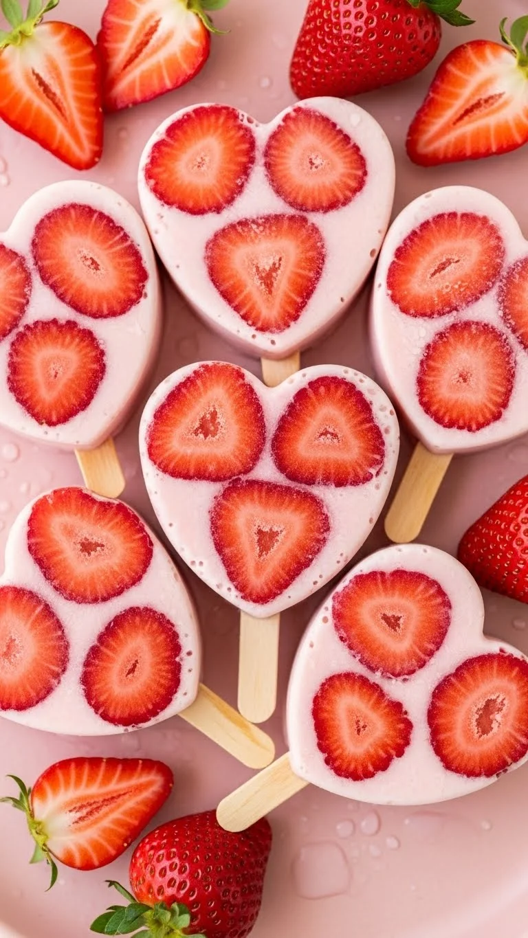 Sweet and refreshing, these heart-shaped strawberry popsicles are perfect for Valentine’s treats, kids, or parties.