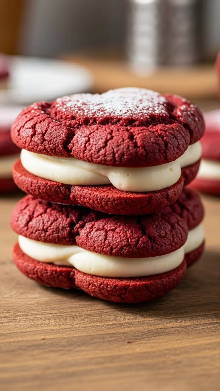 Soft red velvet cookies filled with cream make adorable Valentine’s treats that are bite-sized and festive.