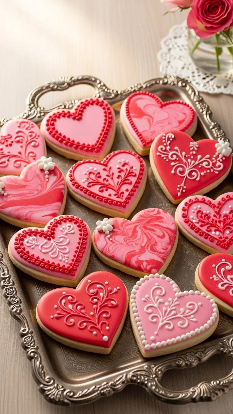 Classic sugar cookies shaped like hearts can be decorated with royal icing, sprinkles, or edible glitter for a colorful and festive Valentine’s treat.