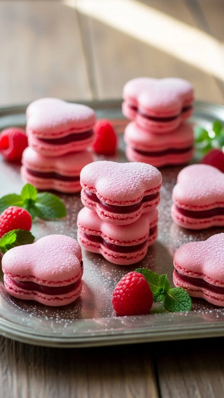 Delicate almond meringue shells with raspberry filling create an elegant, romantic treat perfect for Valentine’s.