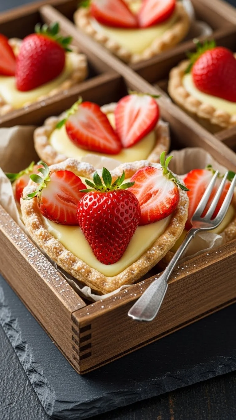 Buttery tart shells filled with custard and topped with fresh strawberries create a romantic, flavorful dessert perfect for Valentine’s Day.