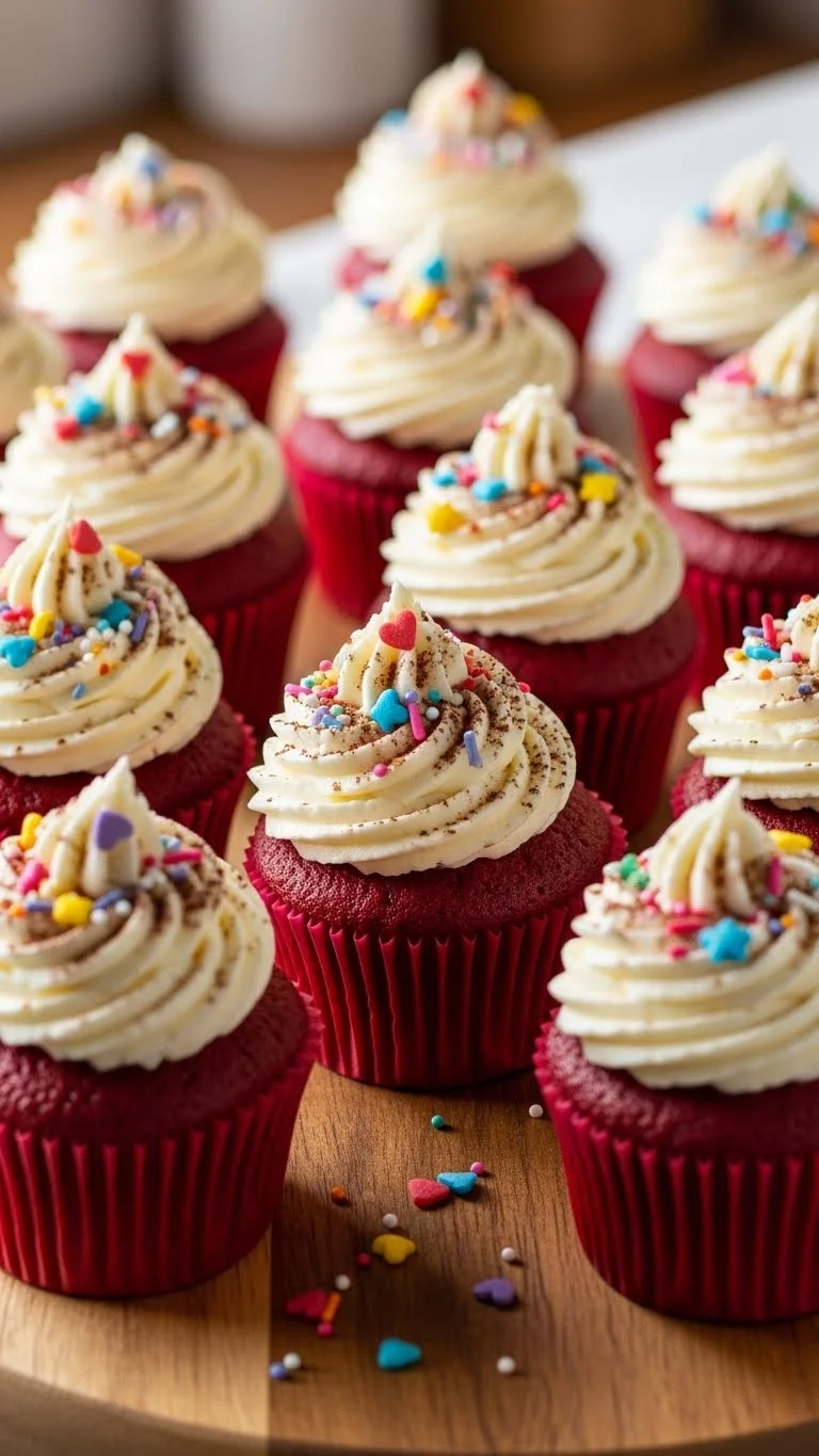 Mini red velvet cupcakes are perfect for sharing. Frosted with cream cheese and decorated with sprinkles, they’re festive and bite-sized.